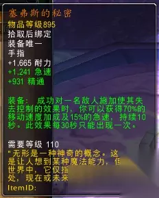 施放任何瞬发技能(包括生命分流)有一定几率获得可移动施法的buff持续15秒。这个buff只要你读了一个有施法时间的技能(不管移动与否)就会被使用掉。但引导类技能不会消除该buff,比如吸取生命、吸取灵魂、恶魔之怒之类的。也就是说触发了这个buff后的15秒内,你可以一直移动吸血。 塞弗斯的秘密(戒指):