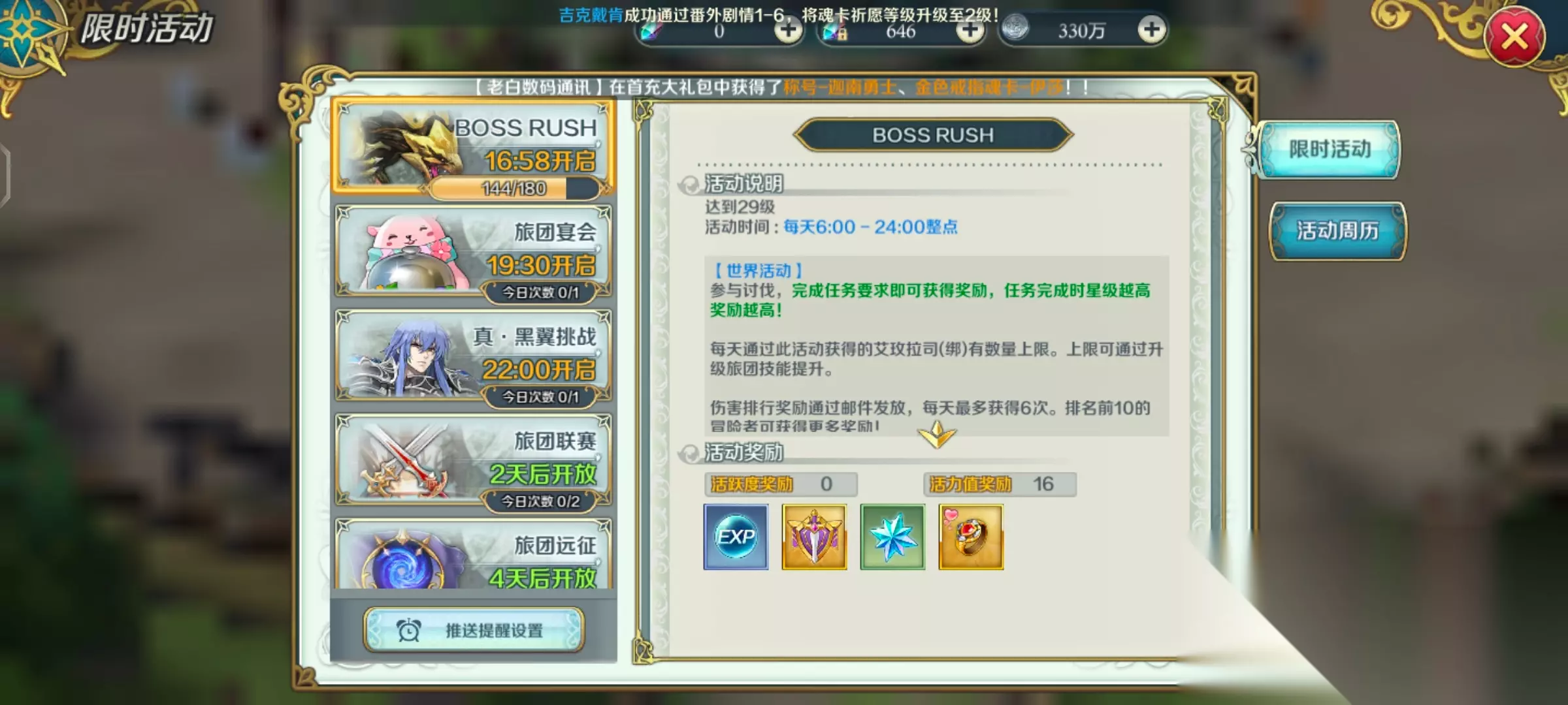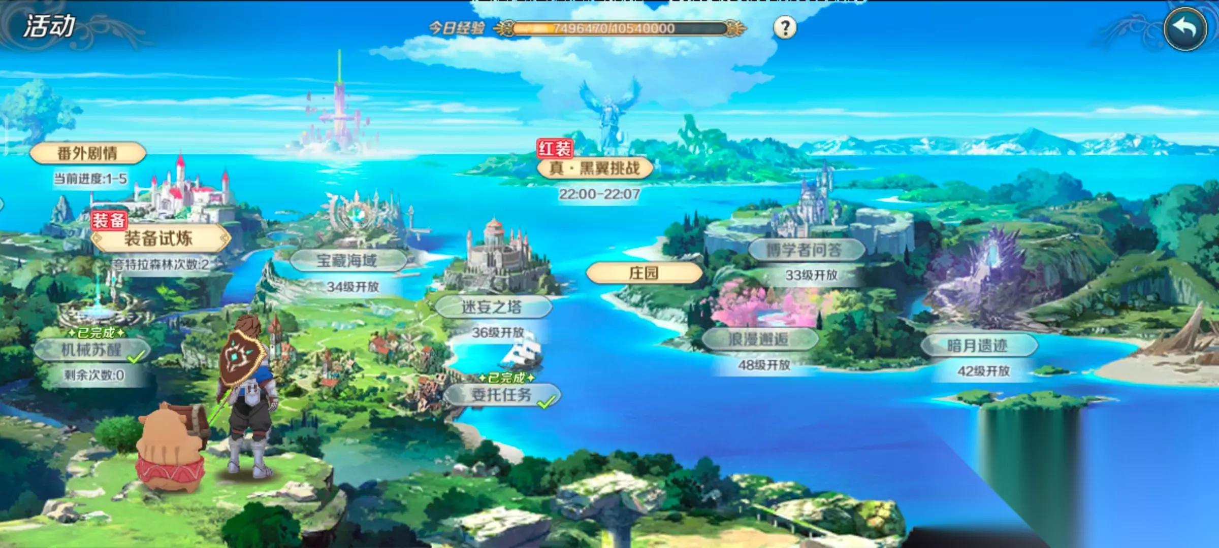 副本活动篇:每日的机械苏醒和装备试炼必须把次数打满,主要产出角色升级的经验和装备,对于角色成长和解锁新的系统极为重要;竞技场每日打5次,平民不用买次数打;第二天左右开放宝藏海域和英雄远征,英雄远征主要获取升级魂卡的材料和宝石,宝藏海域可以获得经验和宠物蛋;迷妄之塔是组队爬塔副本,可以获得红色魂卡、金色魂卡等奖励;第四天开始的海运和暗月遗迹可以获得大量贡献和暗月币;此外每天开放的Boss rush活动可以获得远征徽章,旅团宴会可以获得贡献和装备试炼券,真黑翼挑战可以获得高阶装备升级材料