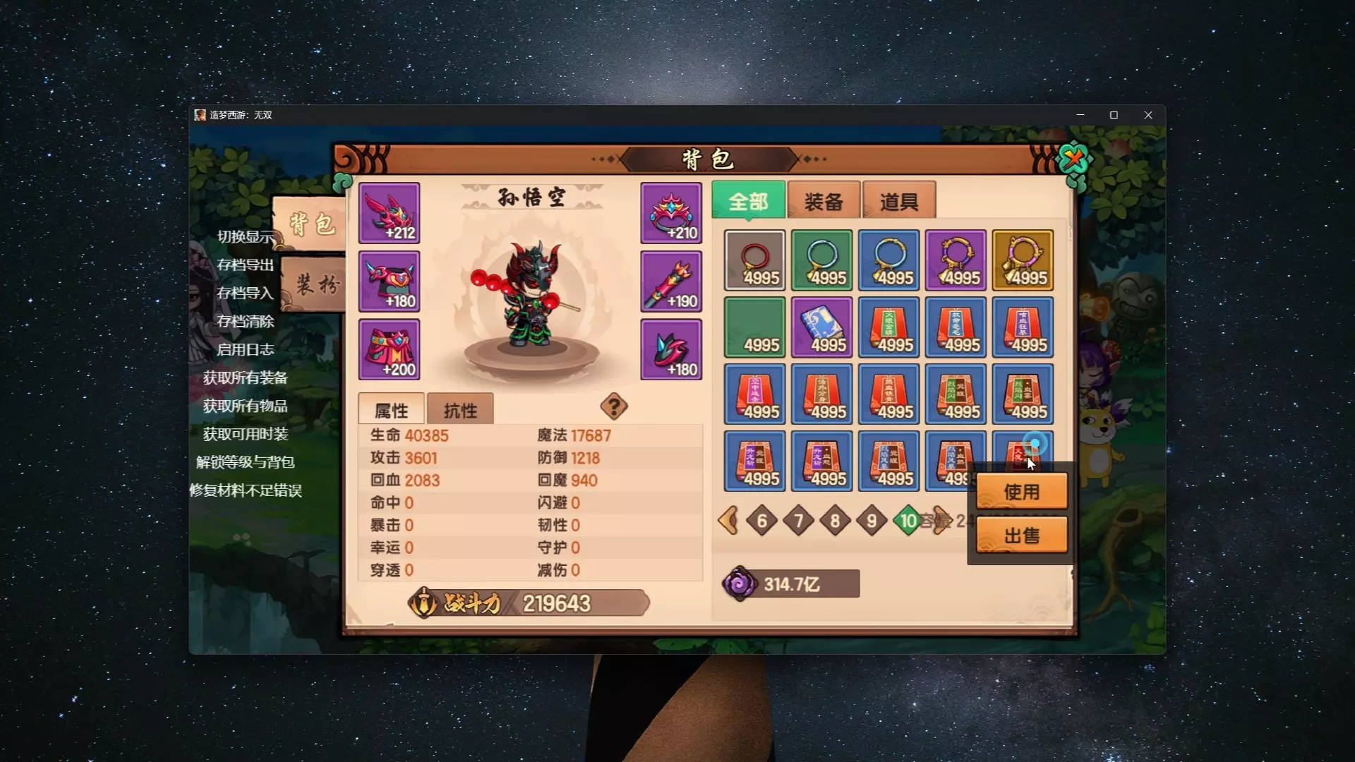 造梦西游无双(steam版本)存档修改工具。一键满级全物品 MOD内容: 导出导入存档 一键获取全物品 一键获取全装备 一键解锁背包限制 一键满级 修复锻造强化…