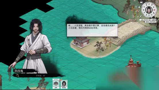 对话结束后我们就准备去找洪四海,跟着目标指引我们来到杭州城的下方,过了桥就能看到他了,他在桥后面的亭子里。只见他心无挂碍、世事皆不关己的样子。和他对话以后他也还认识我们,告知他我们为何事而来,需要丐帮的帮助。随后他告诉我们虽然他爹是前任丐帮帮主,但是已被镇国公所杀,帮主之位已悬置二十多年。现在丐帮中没人掌管,犹如一群无头苍蝇,乱得很,当下有帮主推选这等大事,丐帮中人暂没有他心做其他的事。说罢,我们正想去找其他的人看看,洪四海却说会去帮我们在丐帮打听打听,不过需要三日后再来。