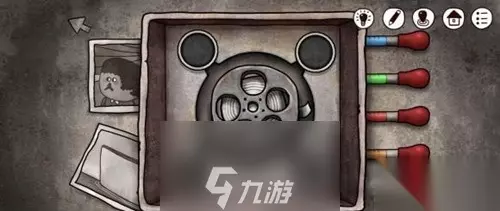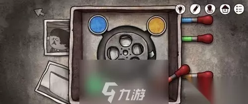打开右侧的盒子,拿出胶卷,我也不知道密码,因为我是瞎试出来的,大概是13211?拿出胶卷在盘子里洗,让你调色,这个时候去电脑旁的机器人镜子上看,因为镜子是反的,要把这四个颜色反过来,如图四所示