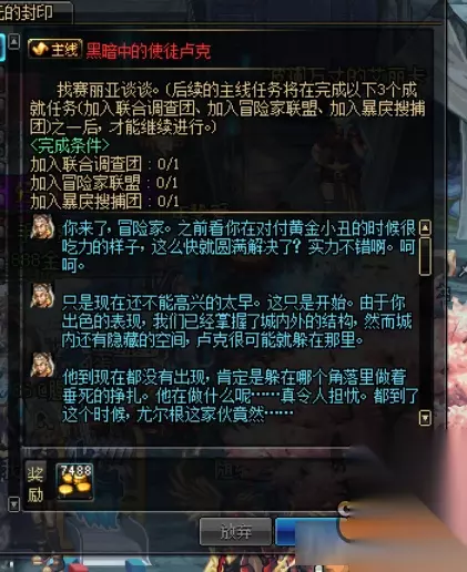首先,完成所有末完成主线任务,会出来一个成就任务,就是加入一个冒险团,随便加一个,找赛丽亚就可以了. 看了上边这篇《DNF》黑暗中的使徒卢克任务攻略,各位玩家是否都了解相关信息了呢!找精彩好玩手机游戏请浏览233乐园。 如转载涉及版权等问题,请作者与我司联系,我司将在第一时间删除或支付稿酬。 DNF2020活动 欲望之塔