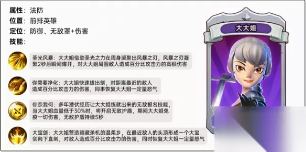 我叫mt归来大姐大属性介绍: 基本属性: 属性:法防 位置:前排英雄 定位:防御、无敌罩+伤害 二、角色技能 圣光风暴:大大姐借助圣光之力在周身凝聚出风暴之刃,风暴之刃凝聚2秒后瞬间爆开,对大大姐周围敌人造成百分比攻击力的高额伤害; 你需要净化:大大姐快速拔出剑,对距离最近的敌人造成百分比攻击力的伤害,同事恢复大大姐一定量怒气; 你奈我何:多年潜伏经历让大大姐练就出来的无敌报名技能,当大大姐血量低于30%时,将开启无敌护盾,期间大大姐免疫一切伤害,无敌护盾持续5秒; 大宝剑:大大姐营造暗藏杀机的温柔乡,在最近敌人的头顶形成一个大宝剑向下直刺,对敌人造成百分比攻击力的伤害,同时恢复大大姐一定量怒气。
