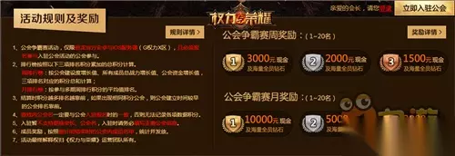 【多维度标准公平竞争 一路比拼显激情】 本次公会争霸赛采用周赛、月赛双重奖励机制。排行榜每日15:00更新积分,周赛排行每7天结算一次,决出周冠军;四期周赛后将角逐月度总冠军,按照相应公会每期周排行榜总积分的平均值进行计算。也就是说,每一天你都是在为周冠军和月冠军双重荣耀而努力。 本届争霸赛使用的是多维度实力排行标准,力求打造最公平的竞争环境。实力排行按照周期内“公会建设增长值”、“公会所有成员战力增长值”、“公会资金增长值”这三项标准对应的积分总合进行评判,如果结算时多个公会相同积分,则建立时间较早的公会排名靠前。多维度的排行标准保证了比赛的公平性,公会之间只看实力,胜负只在瞬息之间,凭真实力赢得真荣耀!