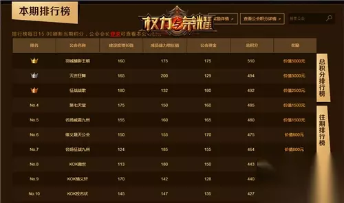 (数据为截稿日期情况,不作为最终排名) 【万元现金敬献王者 多重大奖回报众英雄】 公会争霸赛可谓战况如火,为了赢得冠军的荣耀,玩家们可谓竭尽全力,那自然要有丰厚大奖作为回报。夺得周冠军的公会可以获得3000元现金奖励,而月冠军将获得高达10000元的现金大奖,而无论周赛还是月赛,杀入前20名的公会都可以获得高额现金奖励,同时会长和成员还有最高20000钻石奉送,绝对让每个人的努力都能得到超值回报!具体奖励详情请查看官方赛事活动页,至尊荣耀、超值大奖正等待你来争夺,各大公会快抓紧时间加入战事,努力提升成为至上的王者吧!