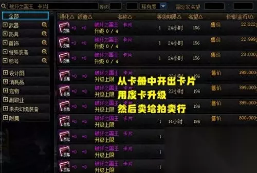 而我们的推荐方法是:将一些有用卡片,升到满级出售,即可赚取中间的差价! 什么才是“有用卡片”呢?比如武器部位的15属强、头肩技攻/力量/智力卡片、上下衣体力/精神卡片等等。 这些卡片都有一个共同点,可作为小号的过渡或毕业附魔使用,举个例子:15属强升级前(13属强)售价1.7万金币,而升到满级后可以卖10万金币;