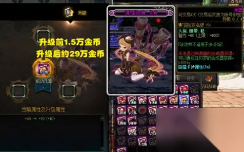 上下衣100精神的大天使米迦勒升级前1.5万金币,升到满级后20多万金币;头肩腰带的破坏之国王升级前2万金币,升到满级后将近40万金币。 由此,我们就可以把一些完全没用的卡片,拿来升级这些有用卡片,每张卡片赚个十来万,一背包卡片也有上百万金币了。 最重要的是,这些神器卡原本作用就不大,放在背包中还占位置,正好用来升级和出售,既清空了背包,又小赚了一笔金币,何乐而不为呢!