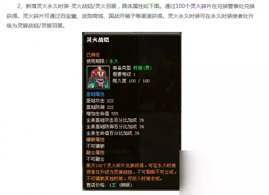 跟消费的永久相比,不能镶嵌时装这一项可以说是比较的坑! 或许很多本着玩游戏就是玩游戏,不花一分钱的玩家!此次的新永久时装的出现,也可以说是个福音! 但是合成需要的灵火碎片,需要100个!而灵火碎片的获得方式那是相当的纠结!为什么说纠结!原因很简单!在官网给出的获得方法中,国战宝箱开出的几率,无限接近于零!至于380金子的百宝囊,我只想说,3.8元人民币一次,如果指着开这个宝箱集成碎片的话,那么我只能说,有钱开那么多次箱子,不如直接买永久时装了!属性还更强一点! 最切合实际的是武勋商城!