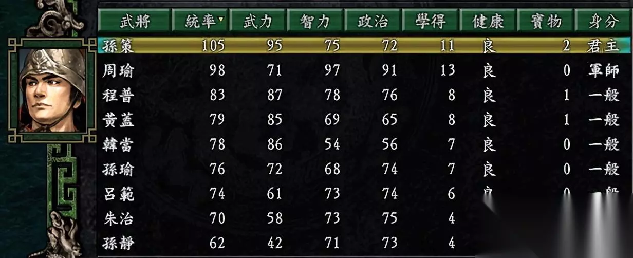 人才方面,孙策和好兄弟属于第一流武将,程普算准一流,黄盖和韩当属于二流,其它就是大众脸了。 这里插一句,孙策曾经在前作里面曾经有些被忽视,来到三国志9才重新回到第一流。