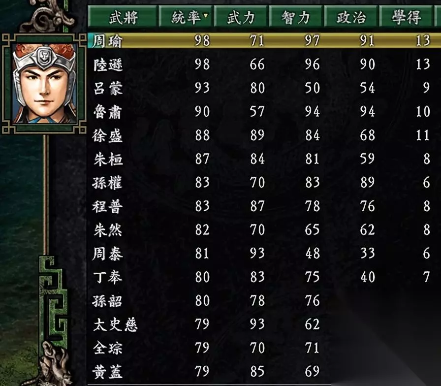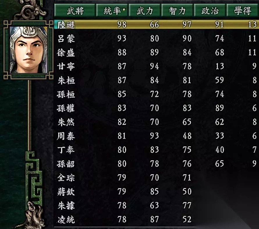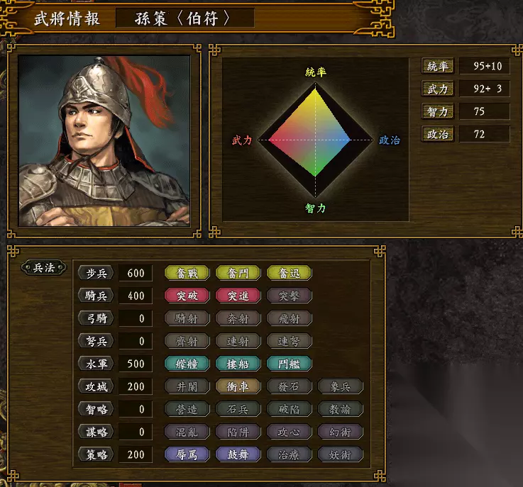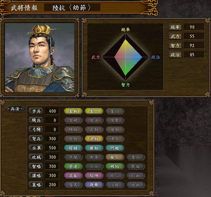 好在回到三国志9得到正名:步兵全能、骑兵懂得【突进】(在江东已经算是难得了)、水军全能、攻城有冲车、还懂两个策略技能。除了没有攻城的弓骑或弩兵外,其它都非常实用,尤其水战和野战。若是补充一个【奔射】或【连射】就更好了。