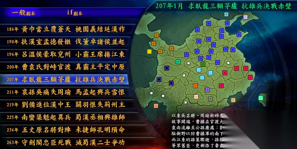 小结一下,这个剧本孙吴势力最弱小,但是有着极为优秀的君主,可以充分地对外扩张吧!享受着势力成长以及把孙策育成为全能霸王的乐趣。 2、207年赤壁之战 这个剧本可以说是曹老板的巅峰时期,刚刚平定北方,完全吞食了第一大势力袁氏,人才、兵力、钱粮都是远远凌驾于其它势力的。