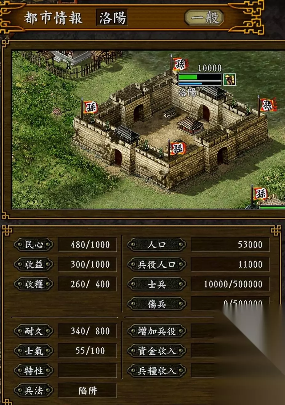 那么这个剧本好玩在哪儿呢,答案就是孙吴势力里面最困难的剧本。 我们看看开局的据点,原本比较兴奋,开局就占着洛阳首都,可是仔细打开城市详情一看,妈呀,被火烧的洛阳,简直就是废城。收益的潜力是最大,可是人口太少了,只有区区5万,在三国,人口才是第一生产力。 还有最惨的就是周边几乎没有发展空间,西边是虎视眈眈的董卓势力,实力强大,难以抵挡;东边是曹操,人才众多,难以攻克;南面、北面的城市全都有主。 从下图可知,孙坚本城里仅1万,兵役也仅1万多点,要抵抗西边董卓,再向其它方向扩充,可以说是捉襟见肘。
