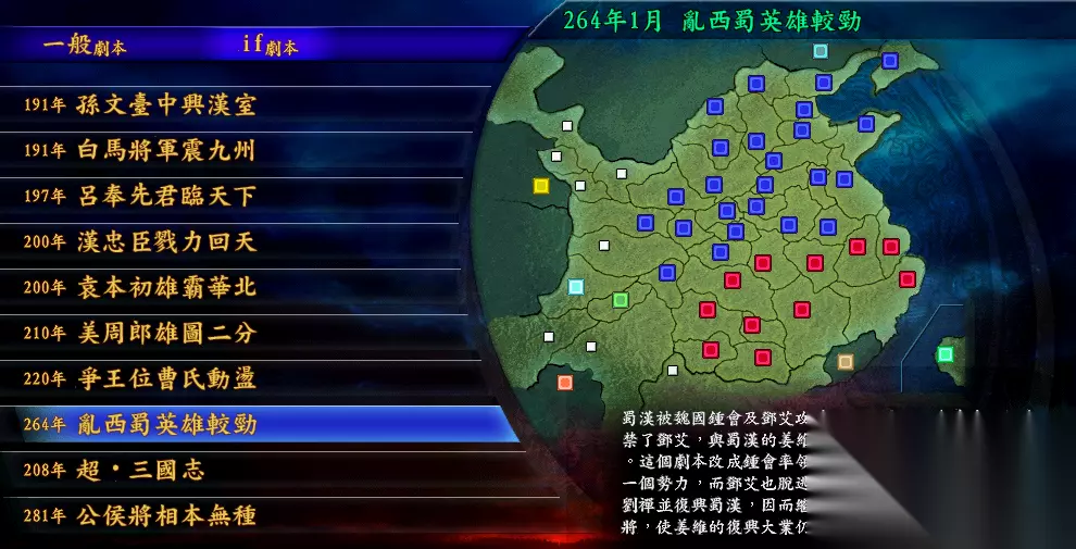 3、西蜀灭亡后的264年 在这个剧本中,原本三国之一的蜀汉灭亡了,变为两个小势力钟会和邓艾势力。而孙吴势力从有盟友共抗北方,变成孤身抵抗。