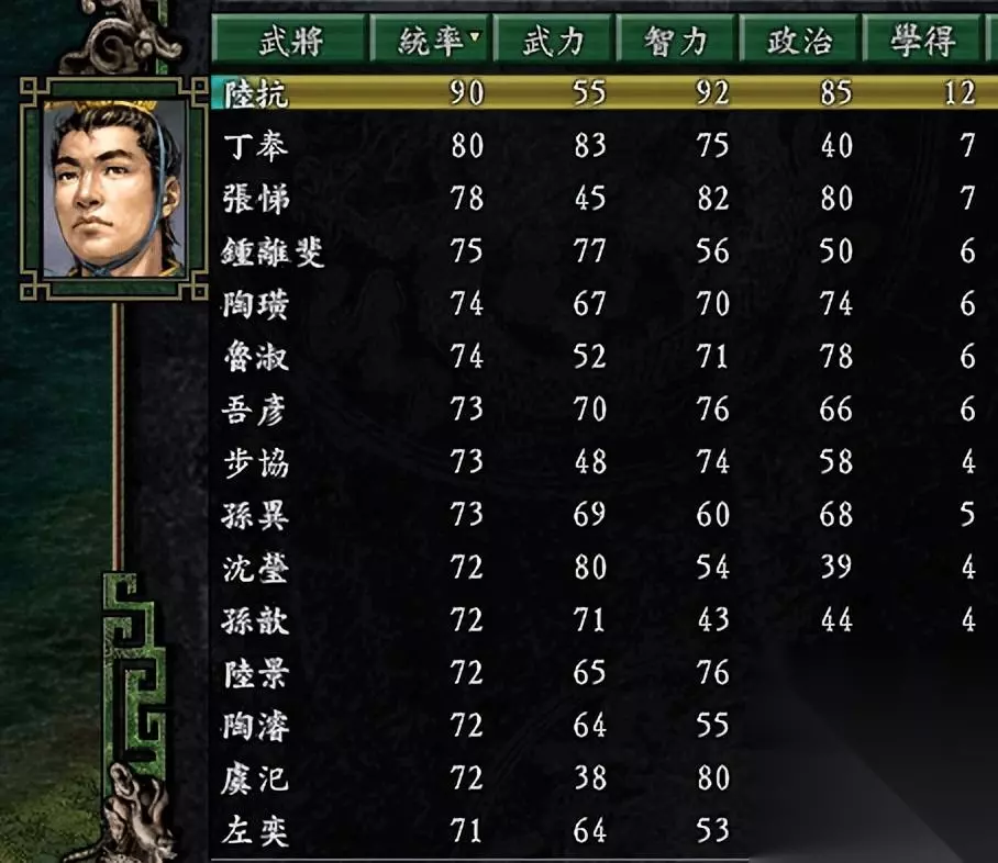 这个剧本好玩的地方在哪儿呢?小编认为就是三国志9的《陆抗传》(参考《姜维传》而创作的)。如果有玩《陆抗传》的玩家一定会非常有代入感。 陆抗虽然不是第一次出现,可是其重要性小编认为是从三国志9开始。首先能力有较大提升,从之前八十多提升为此作的统智双90。