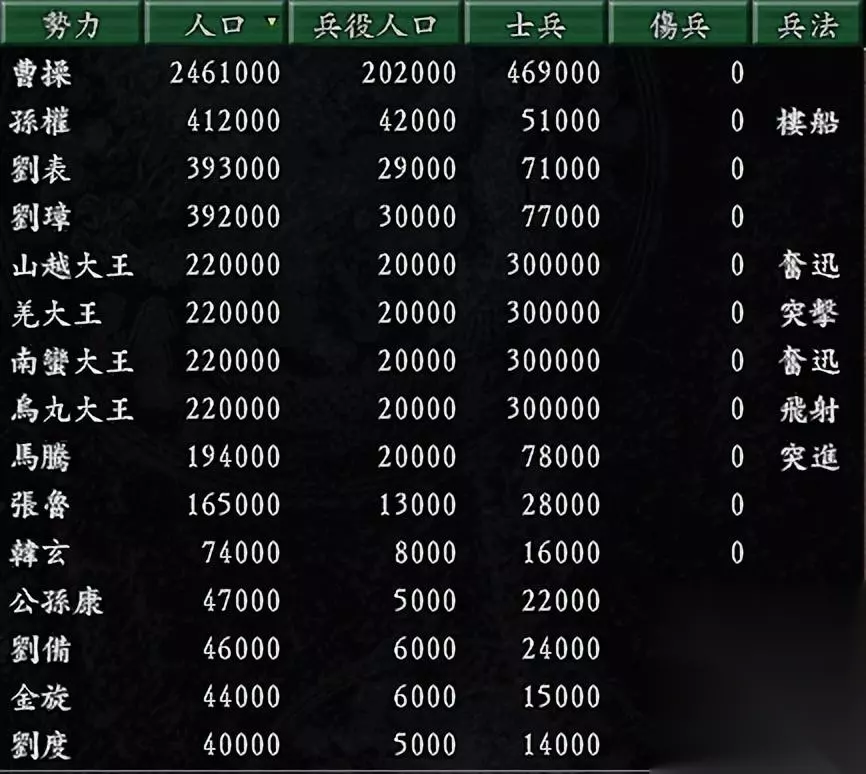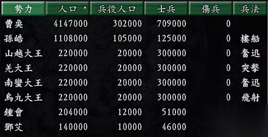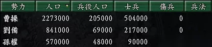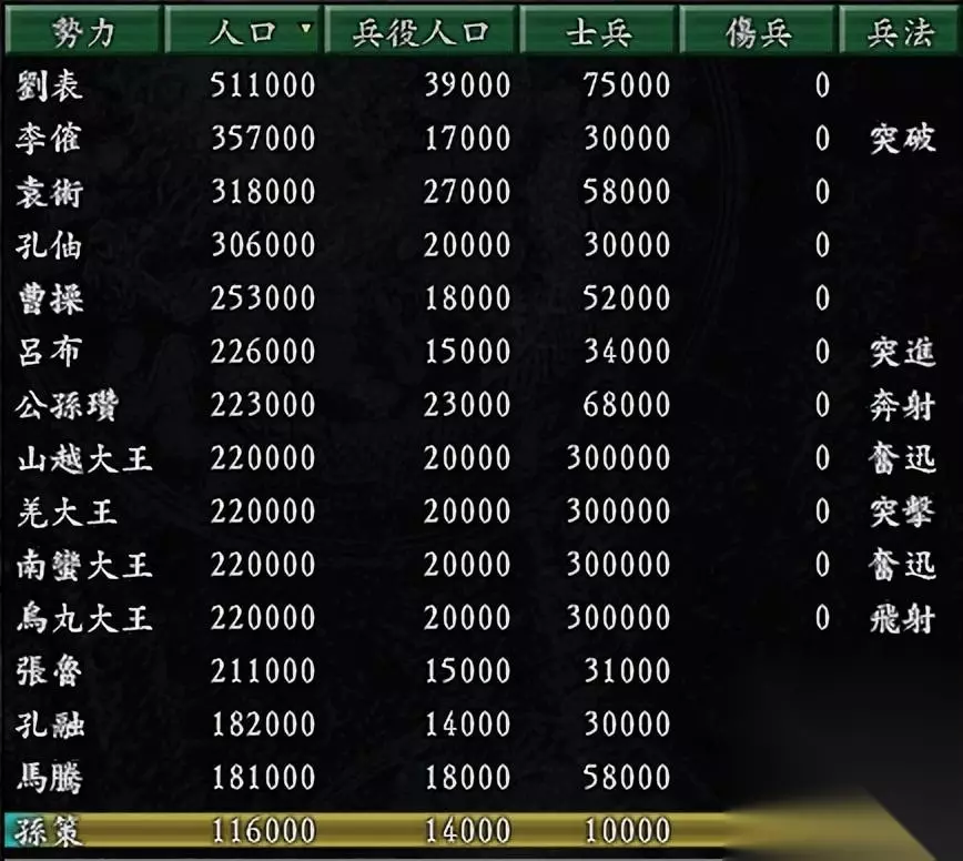 从开局实力看就发现孙策是真的不容易,无论人口、士兵数甚至还排到孔融之后,还没说限于版面没看到前面还有两个势力(袁绍、刘璋),第一大势力的袁绍势力的人口是60万,兵力达11万之多,简直就是天与地。