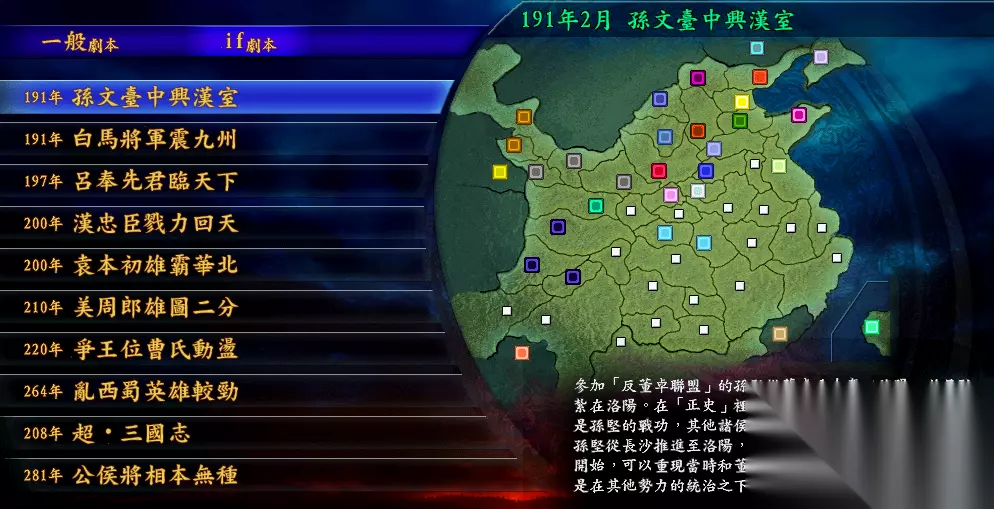 说完了历史剧本,三国志9设计的if剧本同样有趣: 1、 191年孙文台中兴汉室