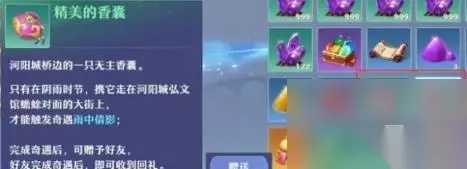 精致的香囊可以通过完成【落水之声】和【箱中女子】后,钓鱼小概率会获得,也可以让朋友赠送。