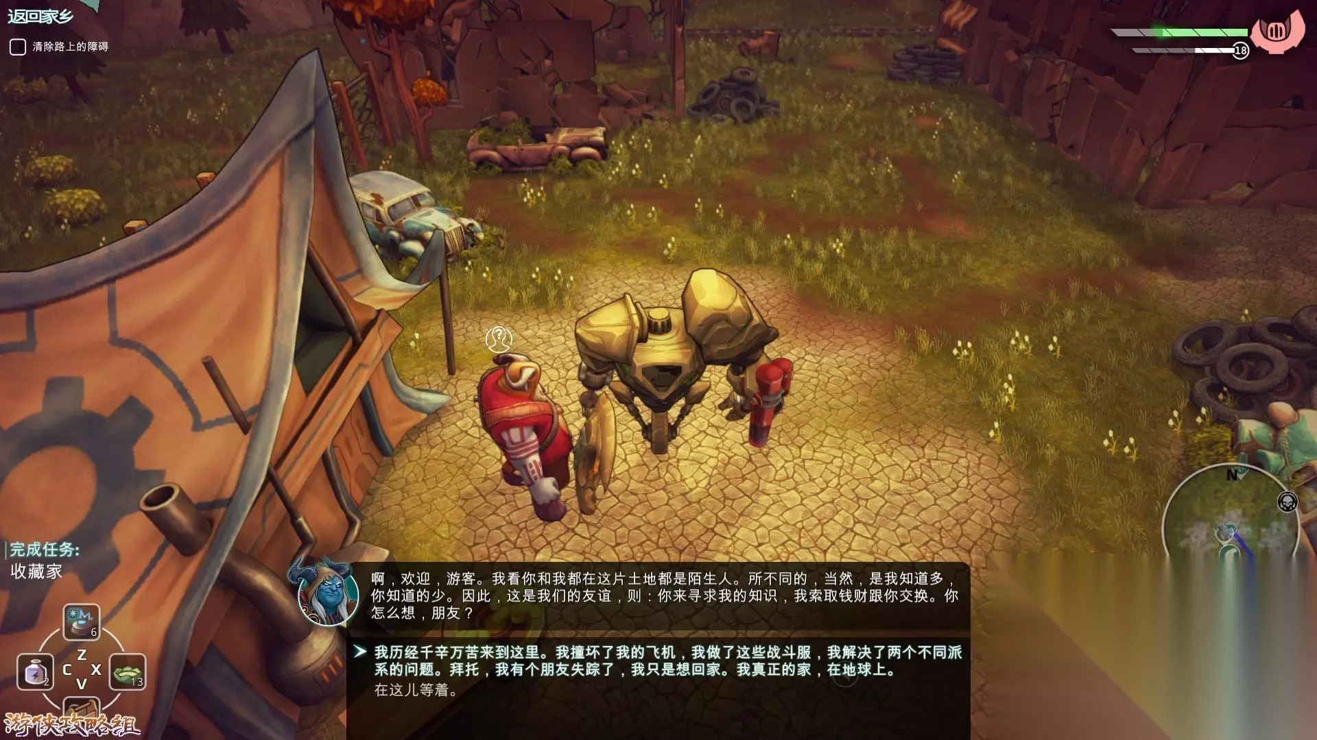 地图二:刀刃捕手营 1,前去同Gnark进行交涉,如果已经完成了无法理解的翻译中的收录gnark词汇到翻译机(也在这张地图上面,将三个Gnark打败就能完成)的话,可以不用战斗,如果没有就会进行战斗。完成之后解锁铁质机器人。