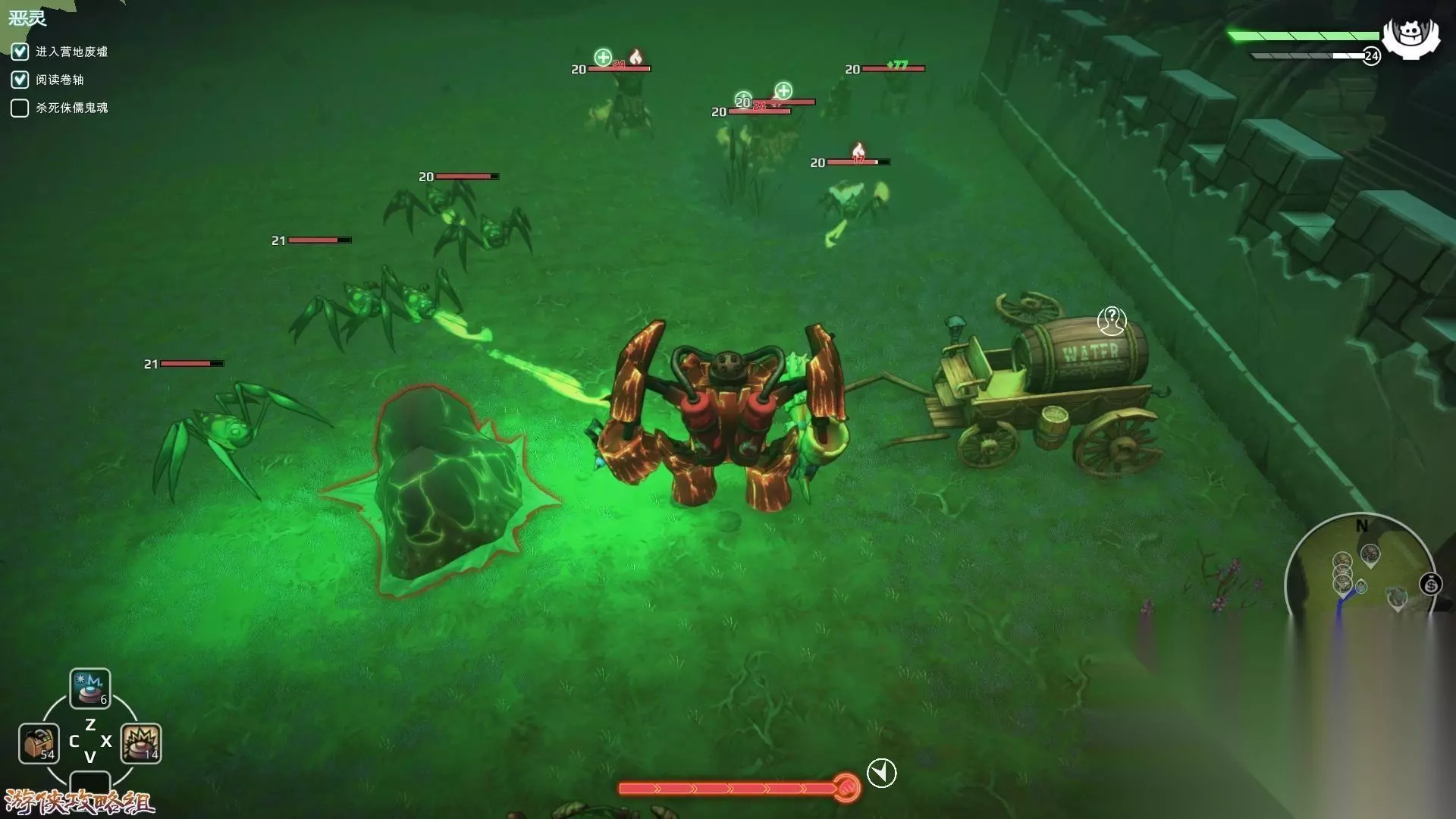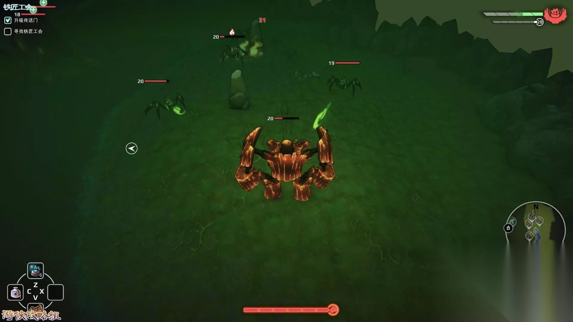 地图:瘟疫沼泽 1,找到探险家的笔记本,然后前往所指示的地点,接下来就是BOSS战了。BOSS的攻击方式主要有两种,大范围践踏和喷射沼气,不论是近身战斗还是远程攻击对于玩家来说都不是很理想,不过使用地雷的话就会相对轻松,在BOSS附近埋雷吸引他践踏自己,记得使用修理箱。