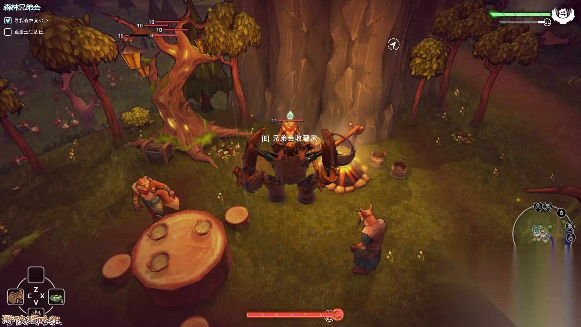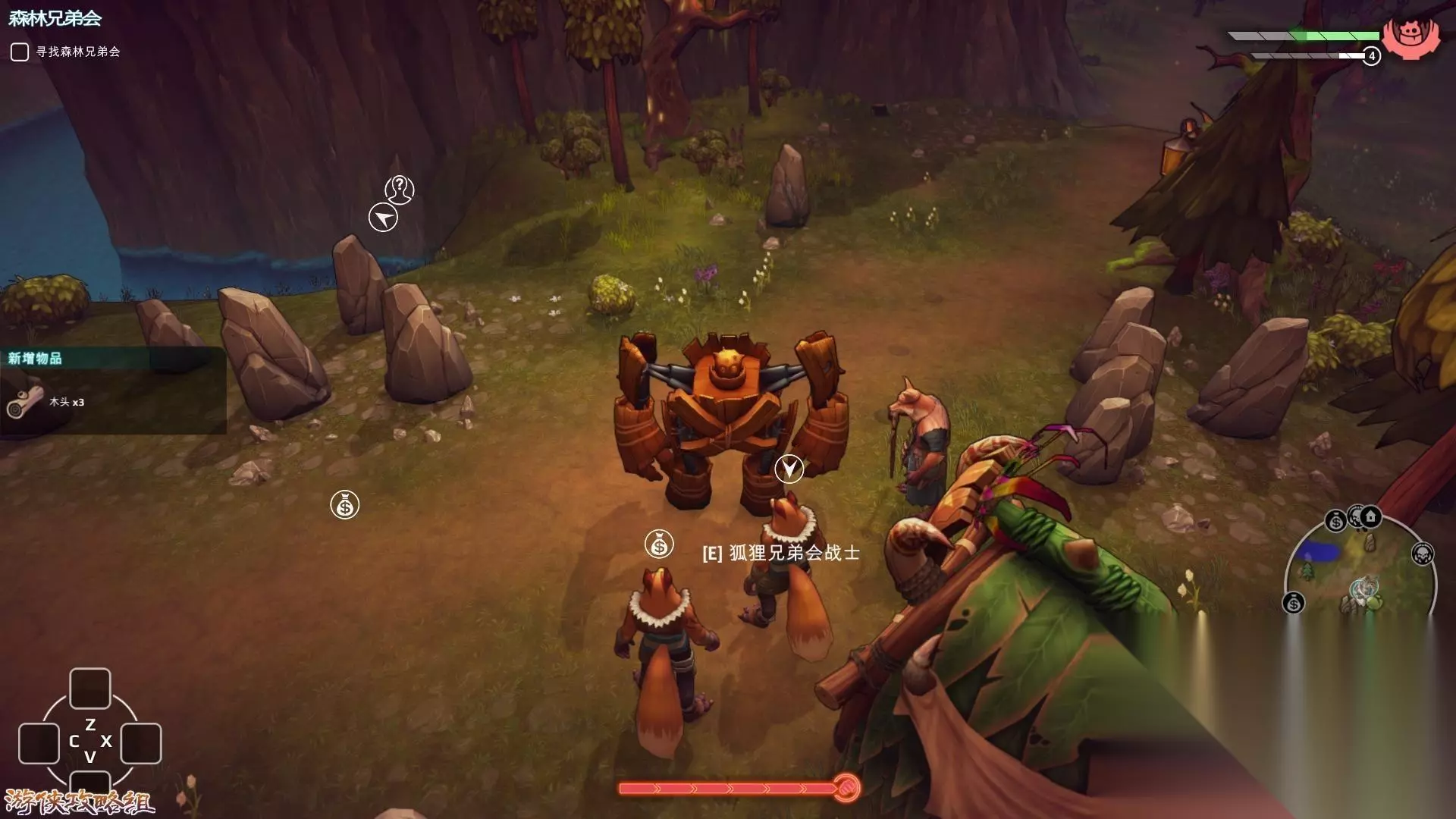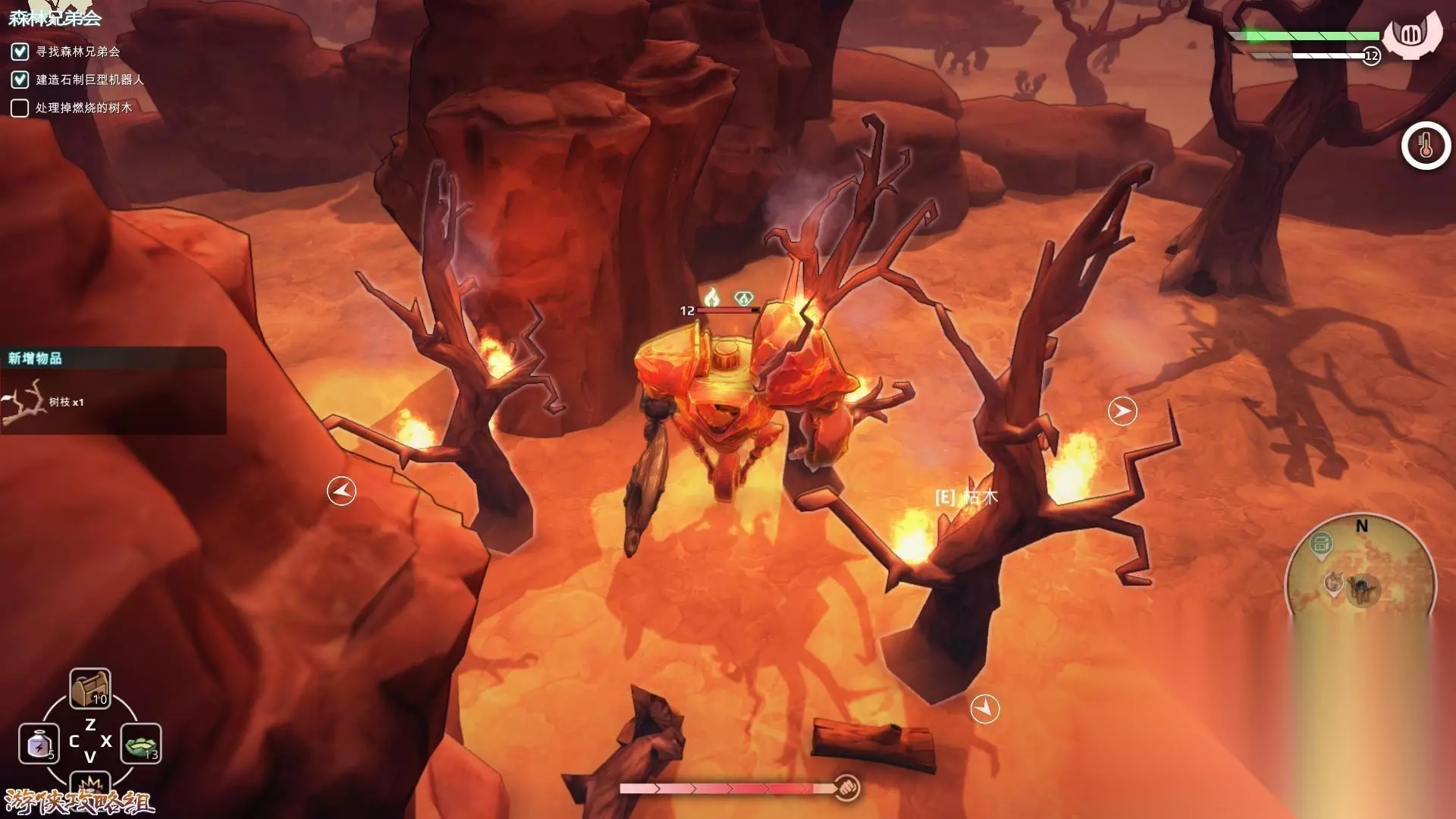 2,回到基地建造出石质机器人(非常强壮RUA),回到那个狐狸在的地方,旁边有条小路,上去砍掉那些燃烧的树,同森林兄弟会首领交谈,就能开启下一个任务。