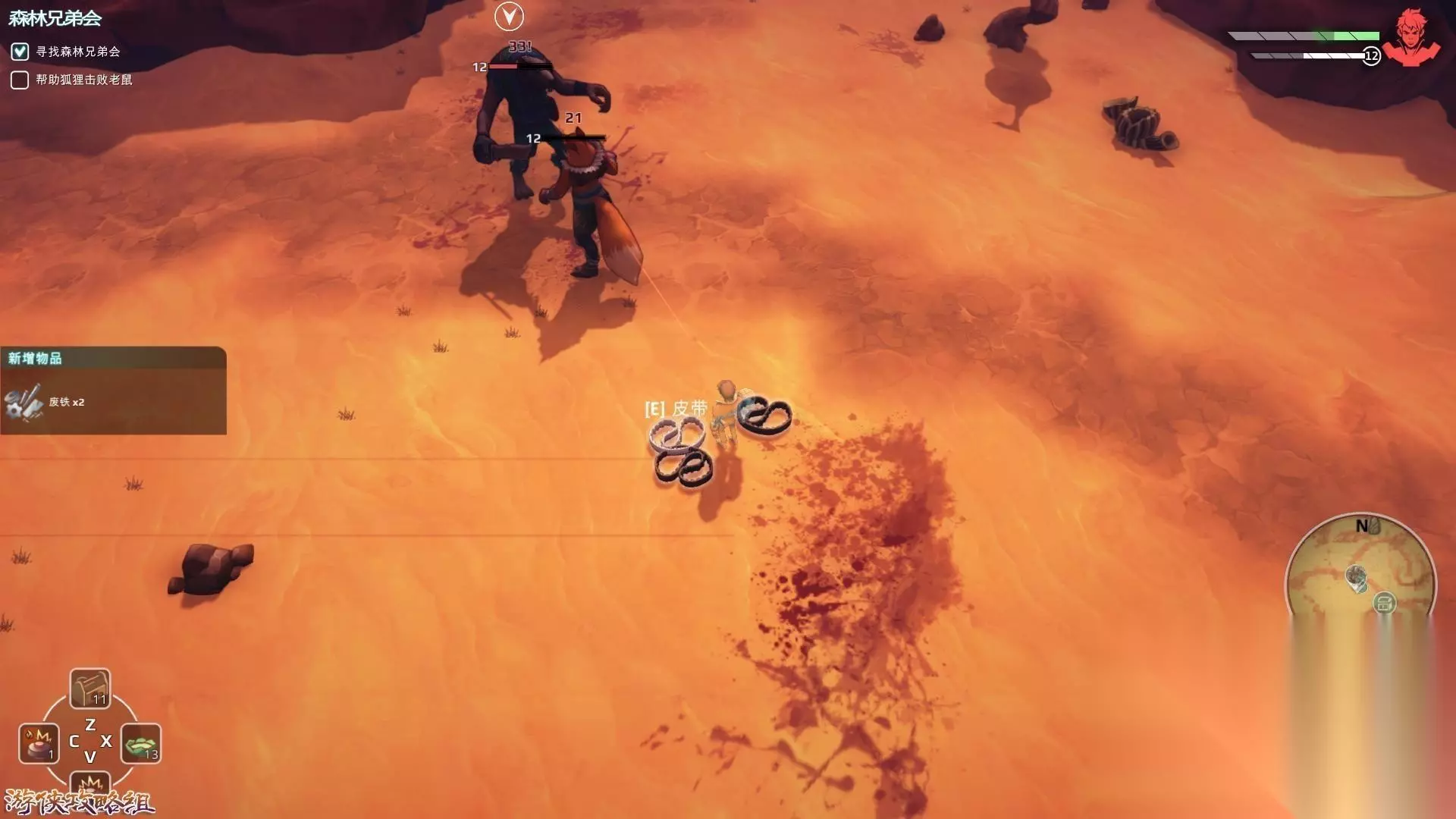 地图三:热浪之握 1,进入地图热浪之握,跟随指示找到一只被老鼠欺负的狐狸,帮助他击败老鼠(tips:这只狐狸并不会死亡,所以我们走远点就好了),他告诉我们为了救出被燃烧树木包围的大部队,需要回到基地建造石质机器人。