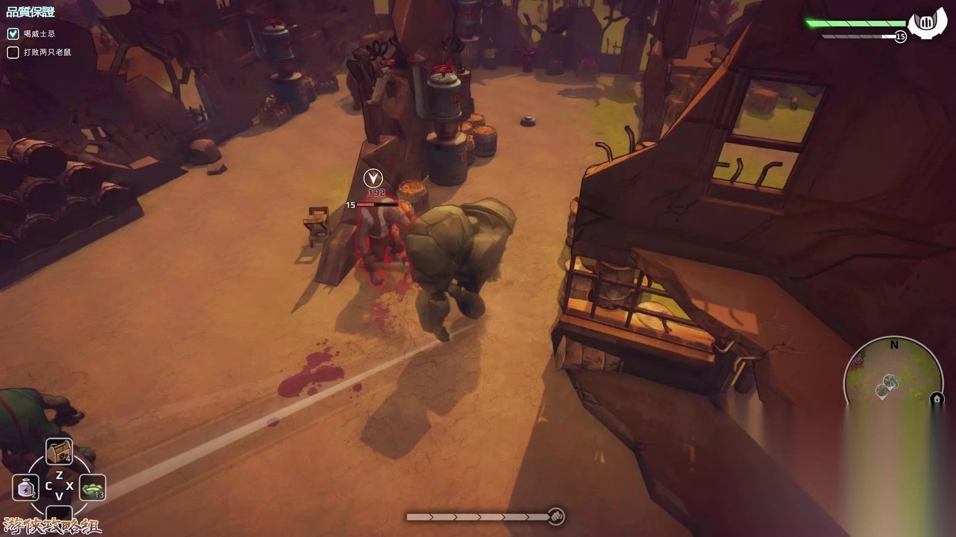 2,先是左下角的私酒商人,让我们喝了他提供的劣质威士忌(会出现幻影效果)后同他的手下搏斗,在地上埋好大量的地雷就可以了