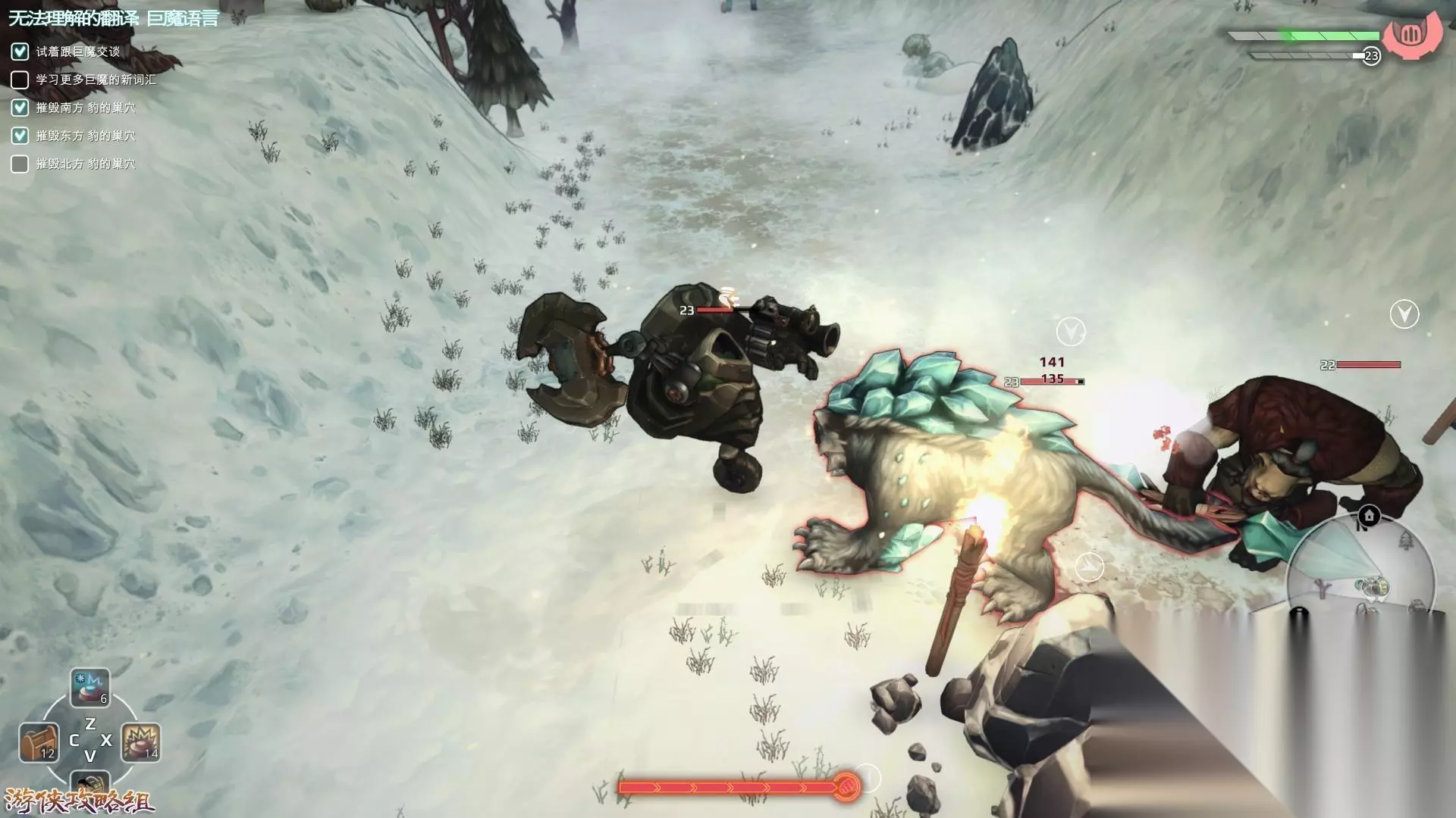 地图三:赤色之山 根据指示找到巨魔,对话触发任务,对地图上的豹子进行扫荡,只要不是同时面对四五只,总的来说还是相对轻松的。完成之后就能回严峻熔炉汇报任务。