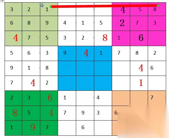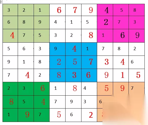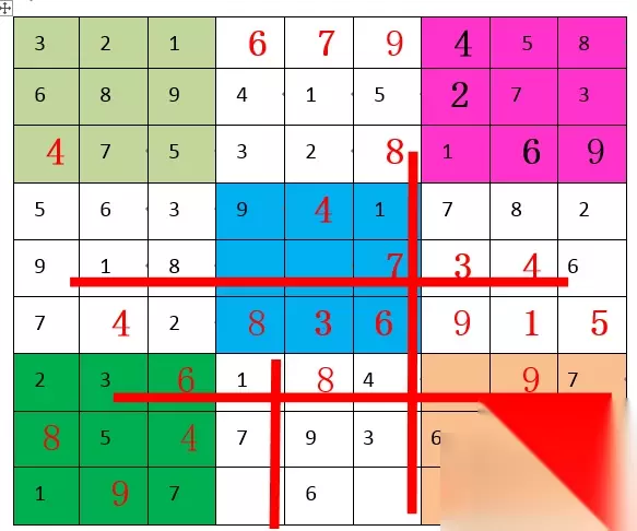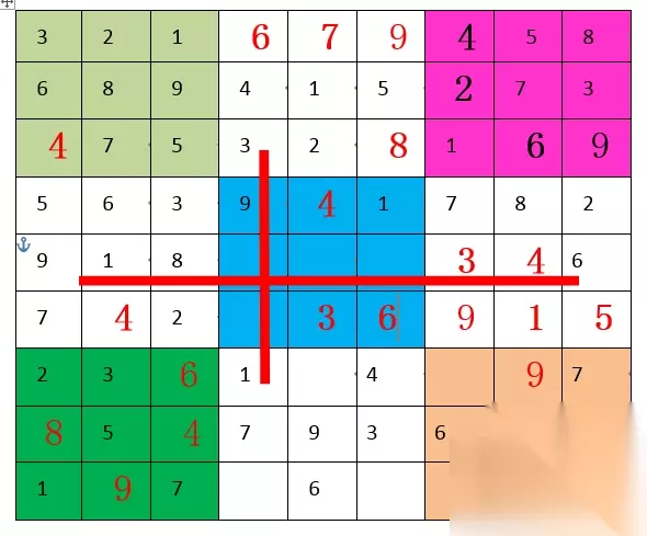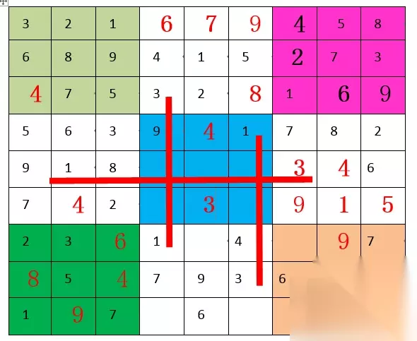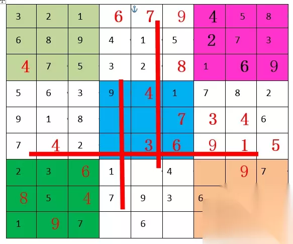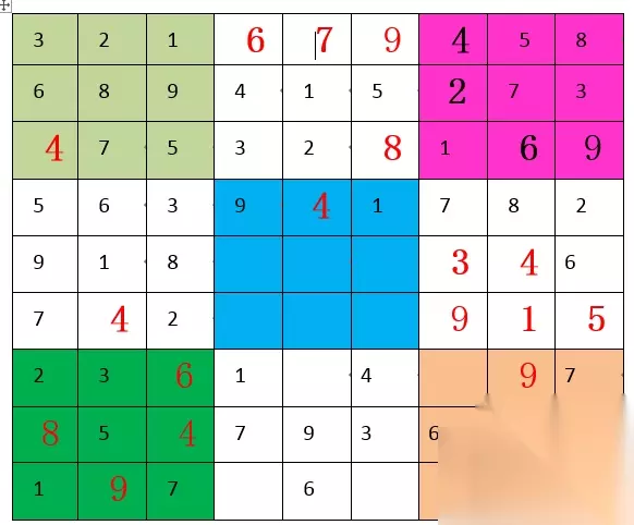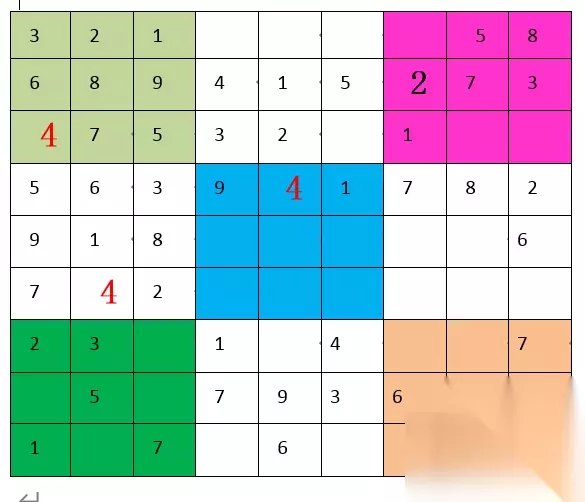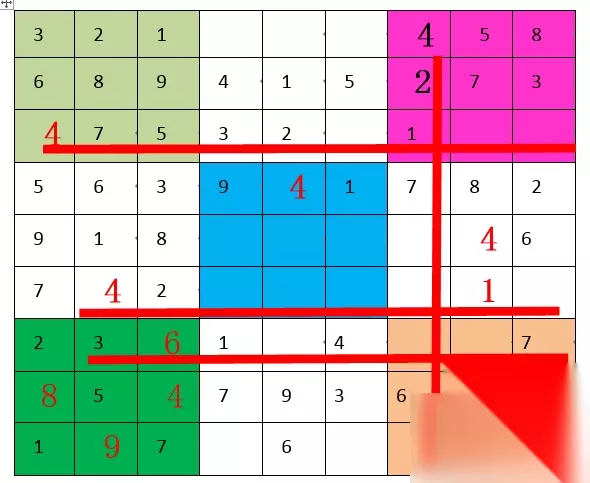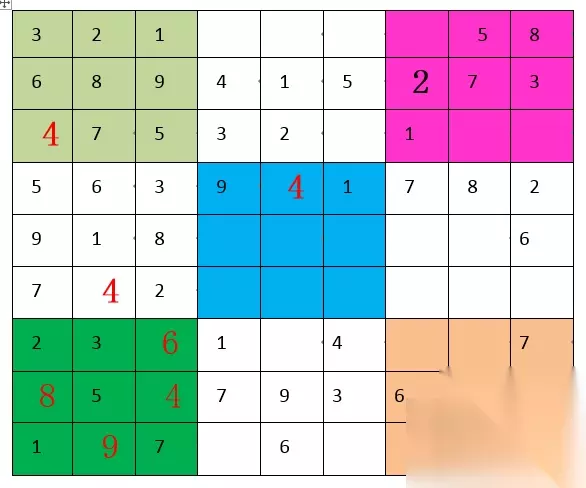“2”,第五宫和第八宫都缺,但具体位置暂时出不来。 “3”,第五宫和第六宫都缺,具体位置也是暂时出不来。 “4”,第三宫A7填“4”,随后第六宫E8填“4”,随后第九宫I9填“4”。"4"填满。如下图: