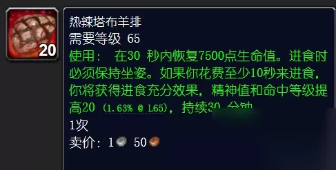 用途 它可以做什么呢?很多人不知道他有两个配方,一个是NPC直接卖的配方,制作后加20耐,这个没啥用。另一个配方是用来做20命中的食物,命中属性的重要性,我就不多说了,在命中未满之前,命中收益最高。而且以目前的装备,命中不可能满的,所以理论上来说,目前热辣羊排是物理职业最好的烹饪。 到了TBC阶段,烹饪得到了加强,同时药水被砍,所以现在打团本,烹饪成为了标配,不再是选配了。