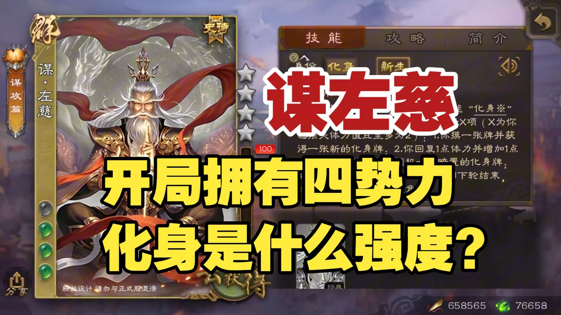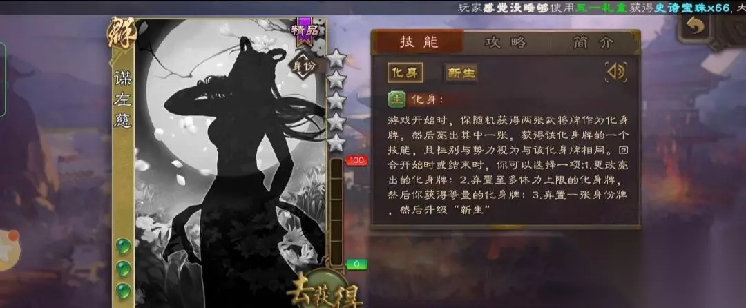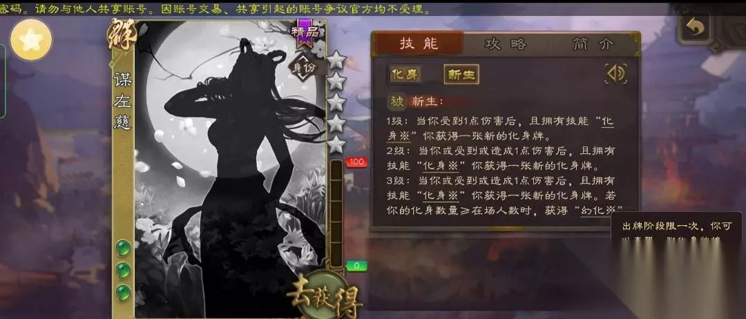 《三国杀》谋左慈技能介绍 化身:游戏开始时,你随机获得两张武将牌作为化身牌,然后亮出其中一张,获得该化身牌的一个技能,且性别与势力视为与该化身牌相同。回合开始时或结束时,你可以选择一项:1.更改亮出的化身牌;2.弃置至多体力上限的化身牌,然后你获得等量的化身牌;3.弃置一张身份牌,然后升级“新生”。