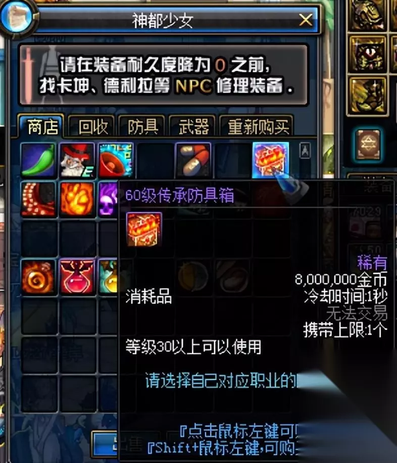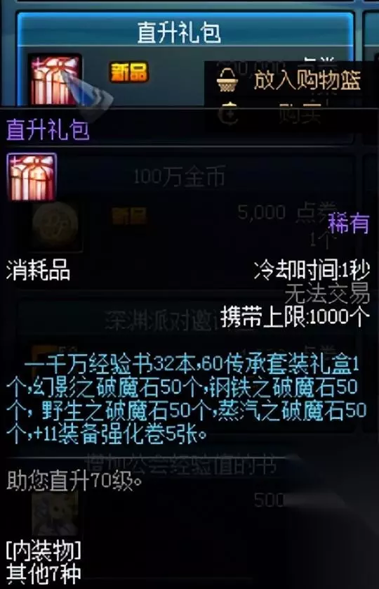 注意:①爱上萌新的基佬:圣骑士人偶,血量非常厚,召唤出来后会给角色加一些基础buff。 ②火辣辣的的绿色辣椒:减少技能35%冷却时间,可以用到脱坑。 ③新手礼包1级:里面的三倍药水可以直接卖掉,无用。 ④十倍经验药水,刷图记得用。 ⑤全职业稀有透明:打开后是一套紫色透明装扮,属性如下。注意不要选错职业,价值2万点券。
