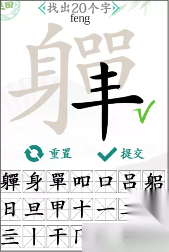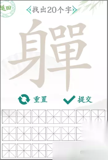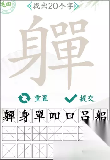 汉字找茬王找字軃怎么过 关卡:第154关,找字軃 关卡提示:找出20个字 图文攻略: 1、首先进入游戏就可以看到上面有一个大大的汉字【軃】,我们需要在里面找出20个汉字。