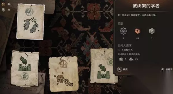 七、被绑架的学者 前往合约板接取合约被绑架的学者任务,根据任务要求去救被土匪绑架的学者,记住不要被发现,否则会直接导致任务失败。 点此查看攻略详情>>>《刺客信条幻景》合约篇被绑架的学者怎么做 合约被绑架的学者任务流程
