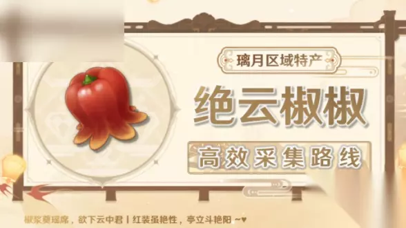 原神绝云椒椒需要到哪里可以采集到呢?属于璃月区域特产材料,主要生长在轻策庄、奥藏山,作为游戏角色香菱、瑶瑶的等级突破材料,全图的数量也是非常多,来看看下面的高效采集路线图吧。