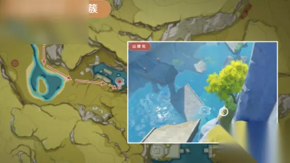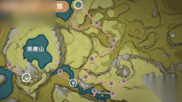 3、奥藏山 数量:33个,奥藏山山上传送锚点处的采集点位于山下湖泊山洞出。