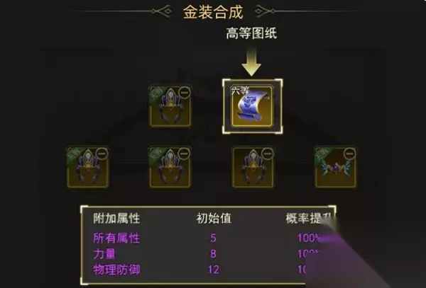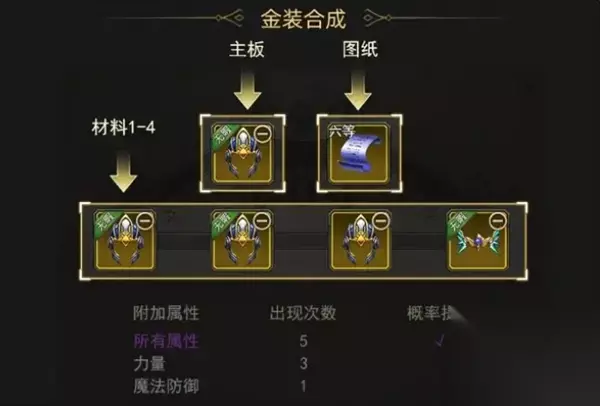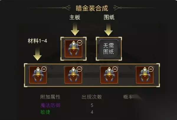 暗金的合成不需要图纸,用4个暗金材料装备凑齐属性就可以合成了,不过这个合成也是有概率性的。