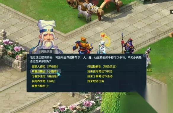 【梦幻西游劳动节2025攻略】 梦幻西游欢喜迎集会活动 活动时间 2025年4月25日12:00-2025年5月6日12:00期间全天 参与条件 角色等级≥30级,队伍人数=5人 活动背景 一年一度的劳动模范评选活动即将开始,三界人们正在紧锣密鼓地准备着此次活动,少侠可以前往现场,查看准备情况并参与其中。 玩法介绍 1、长安城(240,111)在【劳务天官】处进入副本,完成后获得基础奖励,概率掉落【归墟探索令】;