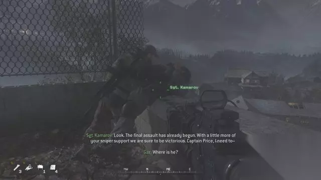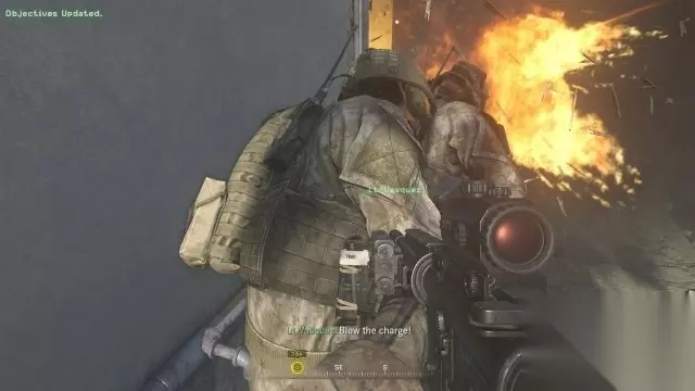 追小扎 屋顶那把拿不到的谜之SVD还在…… Griggs形容Soap的穿着的台词有了字幕,原版是没有的。换子弹时可以看到Soap换上的敌军军服的绿色袖子。 Gaz原版的伪装是黑白混合的头巾,重制版变成了三孔头套。 原版在黑鹰直升机上的机枪手用的是敌军的模型,虽然看不太清楚,好像重制版变成了自己人的模型。