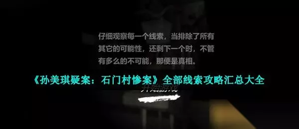 《孙美琪疑案:石门村惨案》全部线索攻略汇总大全 故事背景 案情描述: 在顺义有一个破旧的村落叫做石门村,村民在村落当中闻到了恶臭,在调查之下发现了有八个尸体的手和脚都被缝合到一起了,身体的驱赶以及头部都不见了,所以立即报案了,凶手留下的线索像是在做挑衅,目前警方对村落进行了封锁,那么背后的凶手是会呢? 南河: 刘哥,我回来了,这趟出差太他妈离谱了,你可不知道我都经历了什么,好在洪千祖没我动作快,要不,我可能就回不来了,有很多事我想和你聊聊,你有空吗? 刘青春: 不急,路上说,跟我去看一个更离谱的案子。 随着两个人的对话,新的剧情案件内容展开,那么这个村落背后有着怎样的故事呢?接下来就跟随233乐园小编一起看一下这个案件吧。