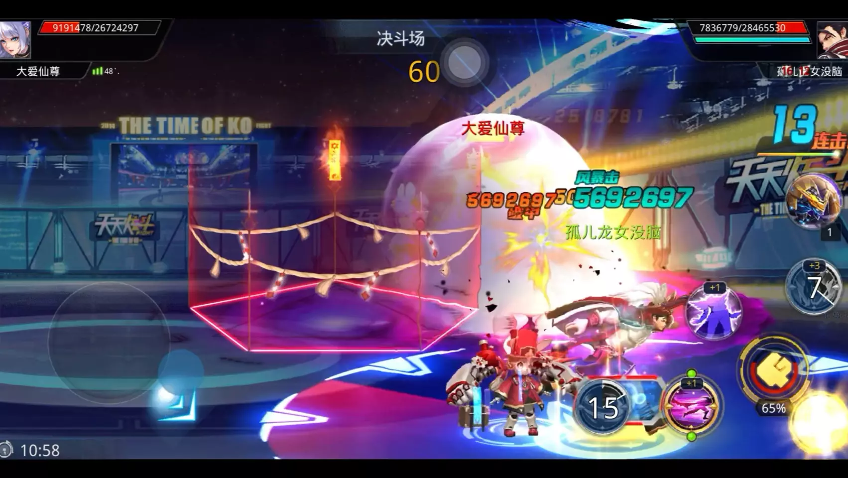 这是玩家分享的天天炫斗决斗场对战场景,玩家使用角色苏慕婉在天天炫斗决斗场对战对手零胜恶魔,玩家吐槽自己角色伤害太刮,支撑不住对战。