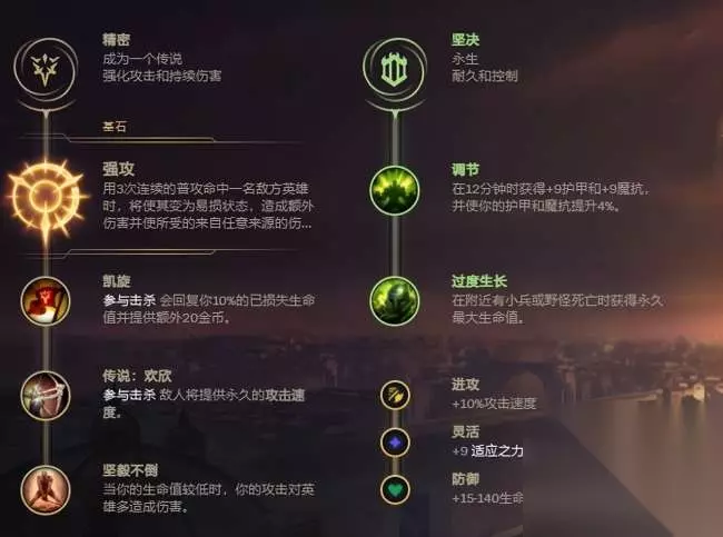 主系:强攻、凯旋、欢欣、坚毅不倒,副系:调节、过度生长/坚定。 两个位置符文点法差不多,唯一的差别就是上单点过度生长,打野点坚定。基石都是强攻,因为龙女A-Q就能直接触发强攻,追着人A。 技能加点