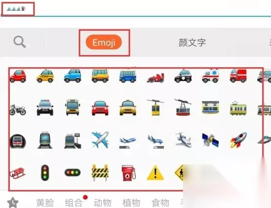 四、接着进入“Emoji表情库”中,逐个点击尝试输入(因为许多无法输入进去,只使用那些能够输入的),输入几个符号的组合,点击输入面板确定按钮。