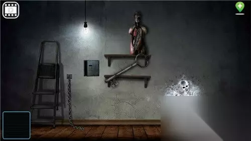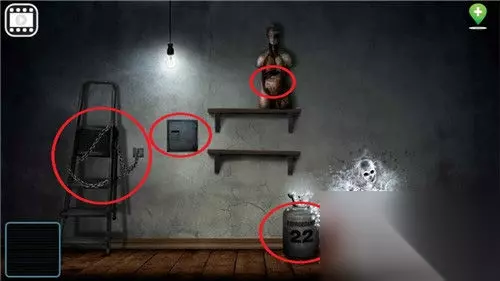 回到上一个场景,进入右边的房间,这里面可以先拿到地上的煤气罐,然后用钳子打开铁链可以得到一个梯子,使用刀片割破模型,里面有一把钥匙;墙壁上有一个保险柜,密码就是之前一开始看到的墓碑上的数字:247,打开后可以得到一卷胶带