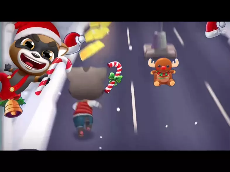 这是《汤姆猫跑酷》的游戏内容展示,画面里身着圣诞装的汤姆猫在不同场景赛道跑酷,躲避障碍、收集道具与金币,还能看到游戏的积分、道具数量等数据,呈现了跑酷过程的趣味玩法。