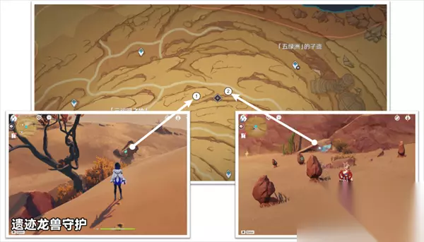 1、解锁方法:指引两个仙灵归位,需要在下图位置进行遗迹龙兽守护、风华的石碑解谜;