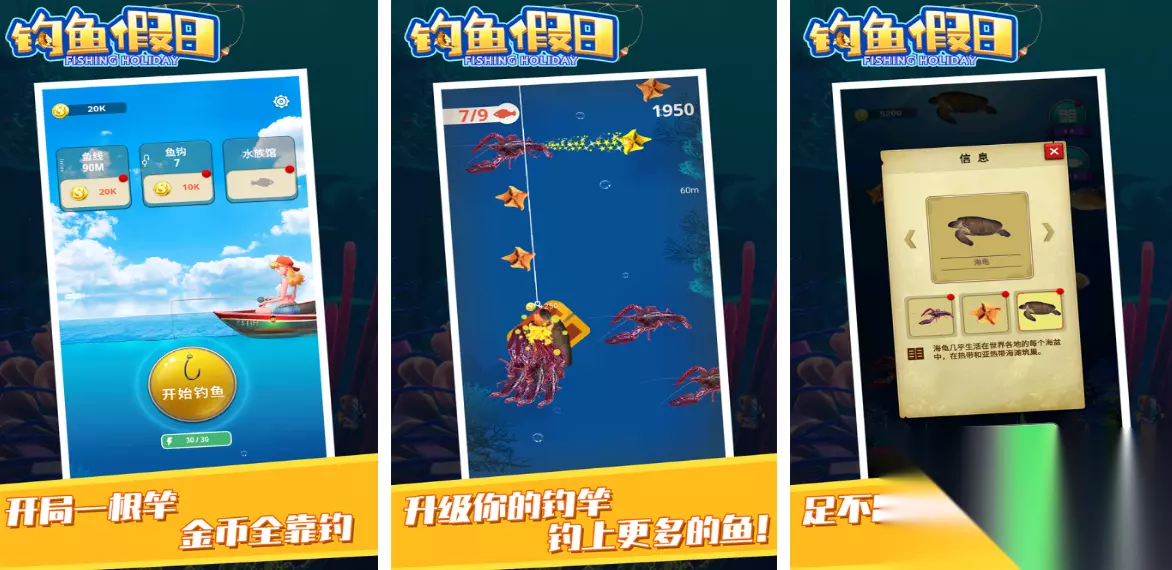 采用卡通的画面以及简单的操作方式,专门可以让更多小宝宝感受到钓鱼的无尽欢乐,这也是由宝宝巴士所创作出来的手游,此游戏的操作方式极其简单,动动手指就能够将鱼饵以及鱼竿等一系列的工具全部准备齐全。也可以一次性使用4根鱼竿完成钓鱼的任务,这种方式比较考验的是玩家的手眼协调能力,在钓鱼的过程中也会遇到很多疯狂的大鲨鱼,此时就要及时躲避避免将鱼儿吃掉。 高速下载 普通下载 优先233乐园APP下载 4、《钓鱼假日》