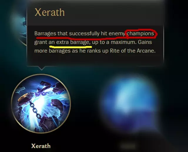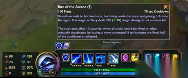 R奥术仪式:依然是1级连射3发奥术弹幕,但是满级后是5发! 新增:在大招持续的10秒时间内,如果命中敌方英雄则会增加一发奥数弹幕。直到时间结束,或主动取消仪式才结束。(测试服目前打到敌人英雄+1发这个效果好像还没实装)泽三炮?不!请叫他泽五炮! 如上图所示,泽拉斯在3级大招的时候拥有5发奥术炮弹。这次没有打中敌人,看看下图集中目标后的情况吧!
