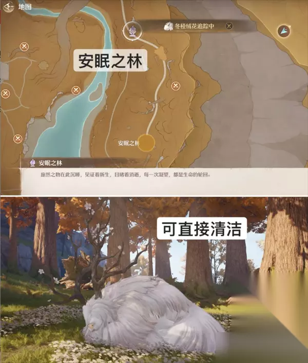 清洁-冬桠绒花(冬桠巨兽): 仅一只,传送【安眠之地】,会有引路的荧光狼(仅引路无法清洁),跟着走到地图下方方向空地,可以直接清洁。(附近会有朝朝暮暮蝶,可以顺路捕虫)