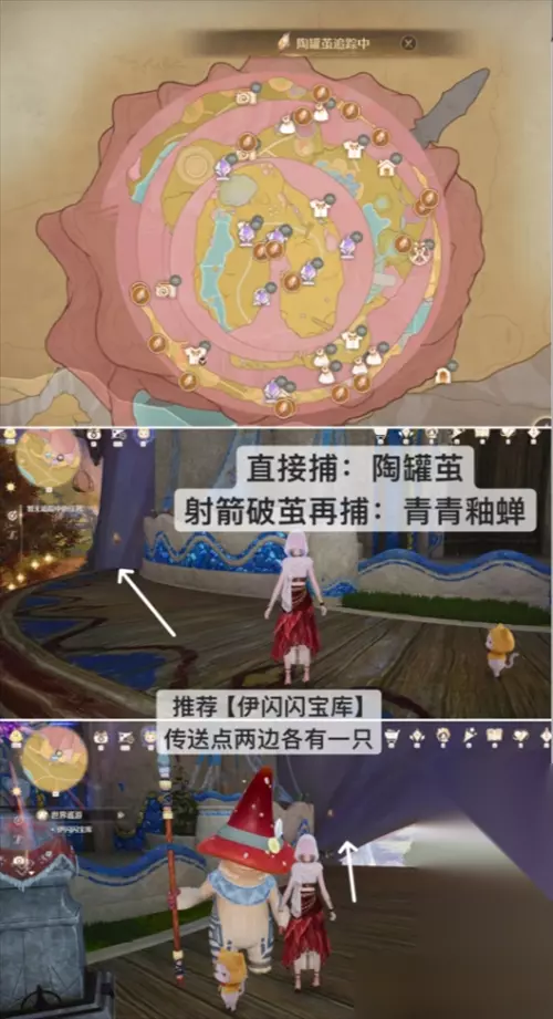 捕虫-陶罐茧/青青釉蝉: 推荐传送【伊闪闪宝库】,如图6台子两边有两个固定点位。靠近直接捕虫可以获得陶罐茧;用弓箭打破茧后会有破茧动画,动画结束后捕虫可以获得青青釉蝉。