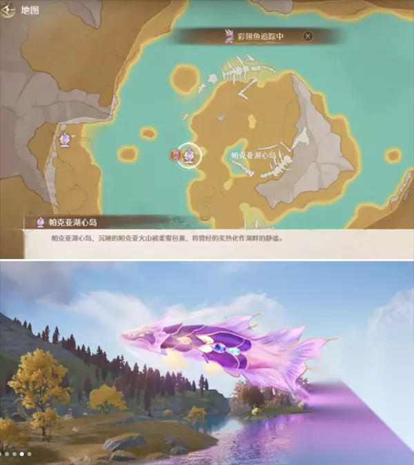 钓鱼-彩翎鱼: 传送【帕克亚湖心岛】,湖心岛传送点可以从下方探险家营地坐船过来解锁。传送点旁边断桥尽头的钓鱼点为每日固定点。其余钓鱼点也会有概率出但不是必出。